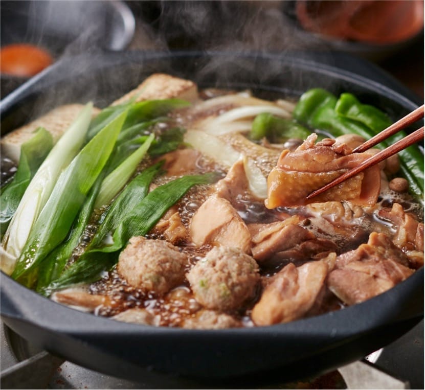 地鶏丹波黒どりの旨みが凝縮。鶏好きのたれを使用した丹波山本名物「鶏すき」をお好みの具材でお楽しみいただけます。